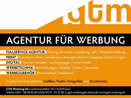 GTM Werbung UG Lanfermannfähre 101 45259 Essen Agentur für Werbung: Fullservice, Print, Digital, Werbetechnik, Text, Musik Telefon 0201 48680068 Mobil 0174 4522801 E-Mail: gtm-werbung@t-online.de |